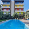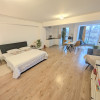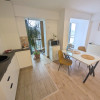 Accesul se face intr-un mic hol ce comunica cu o baie si zona de living cu bucatarie deschisa. Zona in care a fost in trecut o terasa este integrata in camera si ofera o priveliste catre complex si piscina.