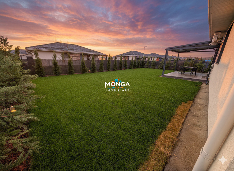 Curtea este amenajata cu gazon, chiparosi decorativi, sistem de irigatie smart, magazie pentru depozitare.