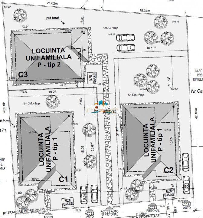 Casa de tip 1 (113mp; teren 685mp) (pe schita complexului este casa din spate marcata ca tip 2)