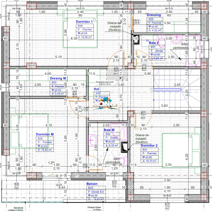 La etaj avem dormitor matrimonial cu dressing si baie proprie, inca un dormitoar cu dressing si unul fara, si inca o baie. Dormitorul matrimonial are acces catre terasa.