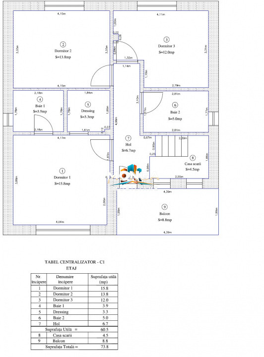 La etaj avem un dormitor matrimonial cu baie si dressing, inca doua dormitoare, o baie si acces catre balcon.