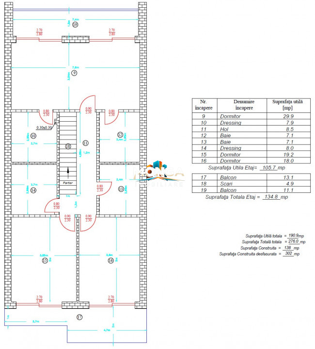 La etaj avem un dormitor matrimonial de 30mp si o latime de 6m, plus dressing si baie proprie. Mai avem doua dormitoare, o baie si inca o camera ce poate servi ca dressing sau birou. toate dormitoarele au acces catre terasa.
