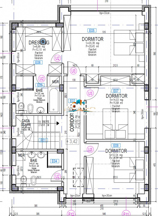 La etaj avem un dormitor matrimonial cu dressing si baie proprie, inca doua dormitoare si o baie.