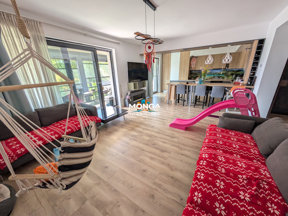Din living se acceseaza terasa generoasa inchisa pentru un plus de confort.