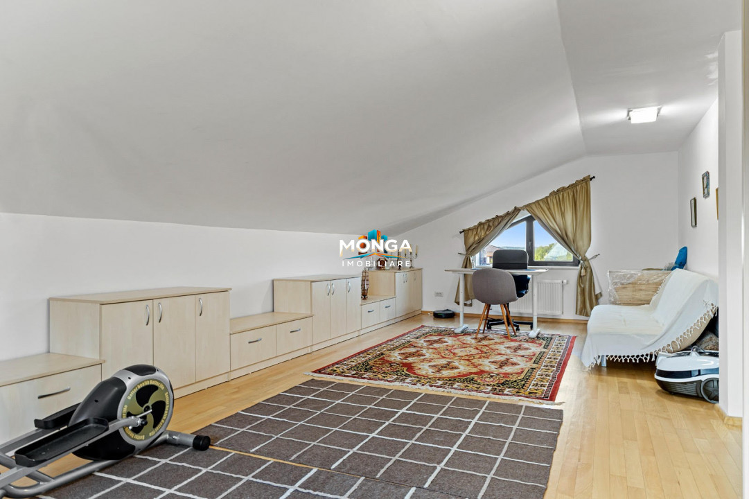 La al doilea etaj mansardat, avem inca doua dormitoare (ideale, de exemplu, pentru oaspeti), o baie pe hol si un spatiu generos ce poate fi folosit ca si birou, spatiu de activitati, etc.