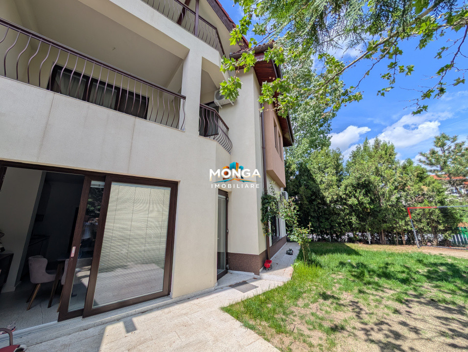 Casa de vinde completa finisata si mobilata premium cu mobilier import Italia de foarte buna calitate. Este localizata intr-un compex privat cu paza si loc de joaca pentru copii. Curte amenajata cu vegetatie matura.